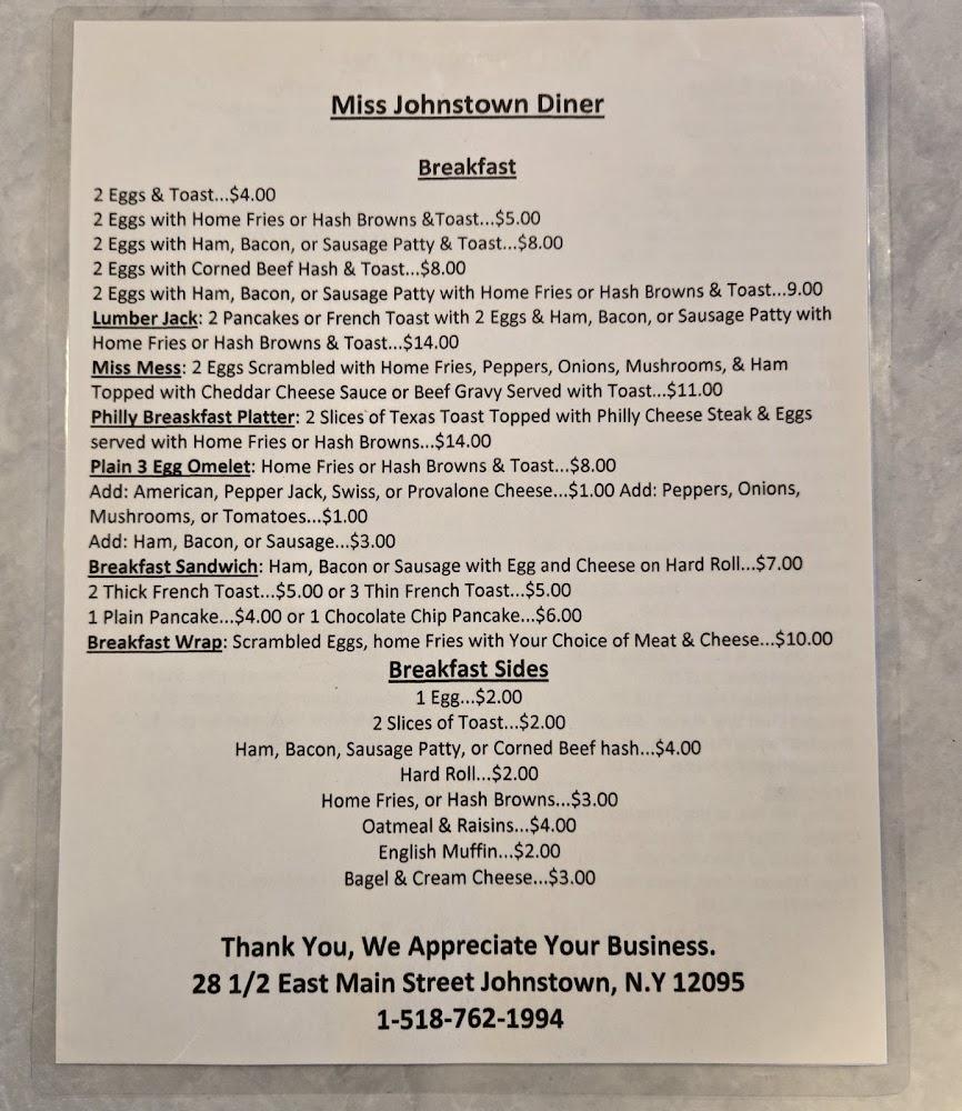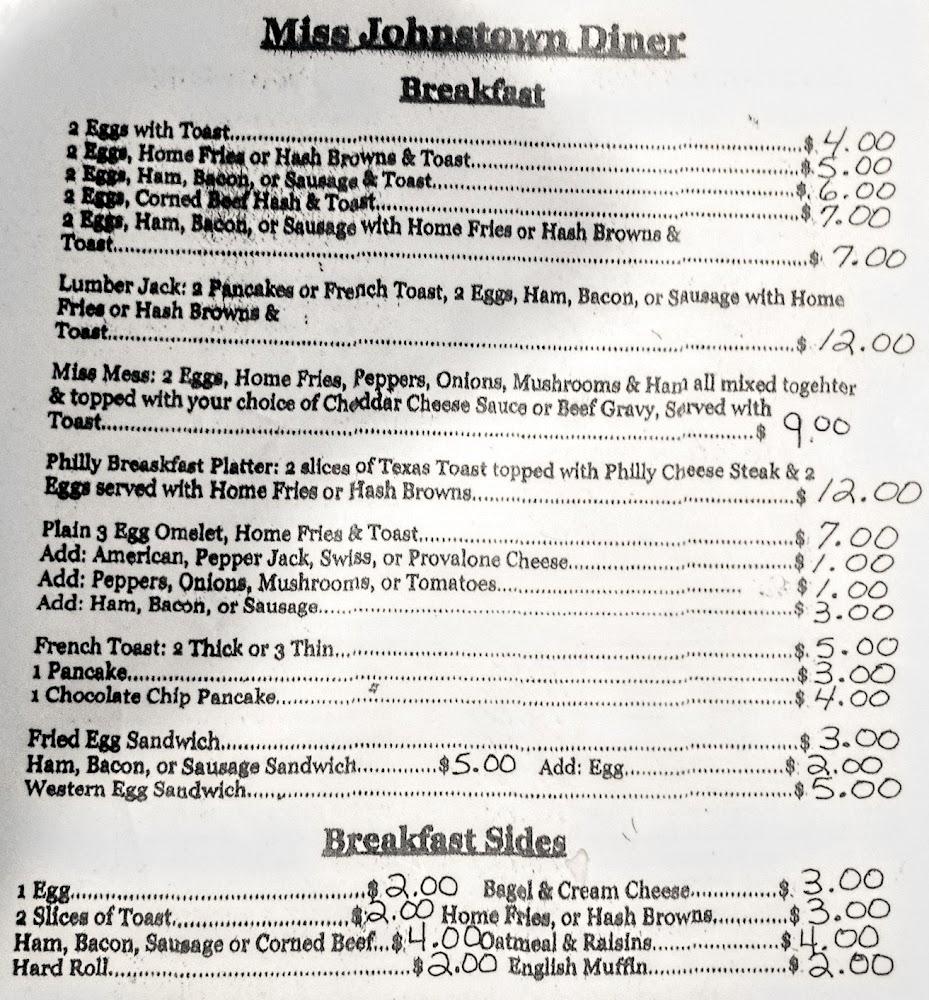 The menu at Miss Johnstown Diner is extensive, featuring classic American diner favorites. Breakfast shines here, with selections ranging from traditional eggs and toast to creative signature dishes.